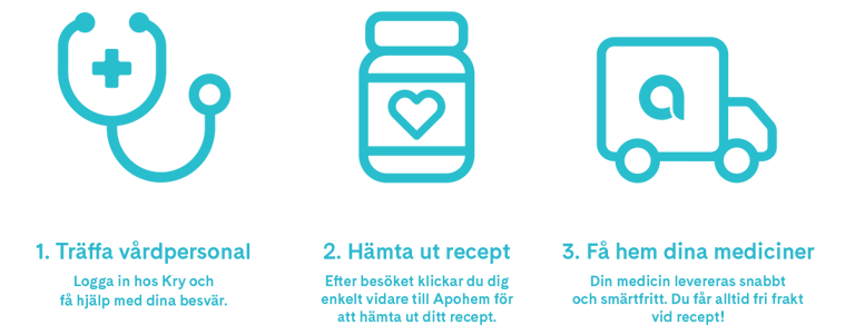 Det ska inte vara krångligt att ta hand om sig själv och de man tycker om. Därför vill vi tillsammans med Kry förenkla hela vårdupplevelsen, från att du får ditt recept förnyat eller utskrivet, till att du hämtar ut det. Efter att ha träffat vårdpersonal hos Kry kan du på några klick få råd av en farmaceut hos oss på Apohem och få din medicin levererad fraktfritt direkt till dig. Det om något kallar vi snabbt och smärtfritt!