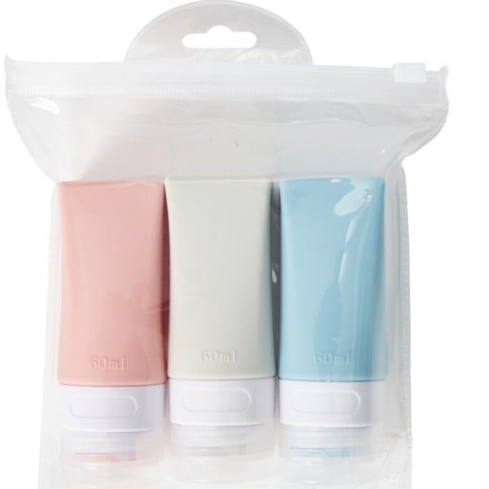 Resekit med tomma flaskor och burkar anpassade i storlek efter vad du får ta med dig i handbagaget. Förpackningarna kan användas till duschtvål, ansiktsvatten, schampo, balsam mm.
