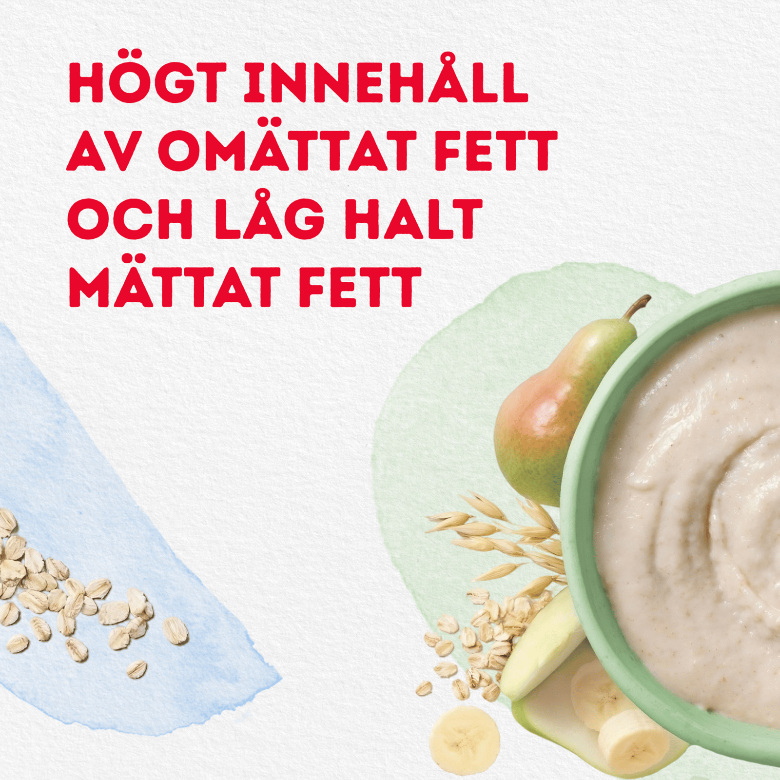 Semper Havregröt Päron, Banan & Äpple är gjord på havre och vete och passar barn från 8 månader. Havre har en mild smak som barn ofta tycker om och innehåller en naturlig blandning av lösliga och olösliga fibrer. Fruktinnehållet är anpassat för att vänja barnet vid en mindre söt smak.