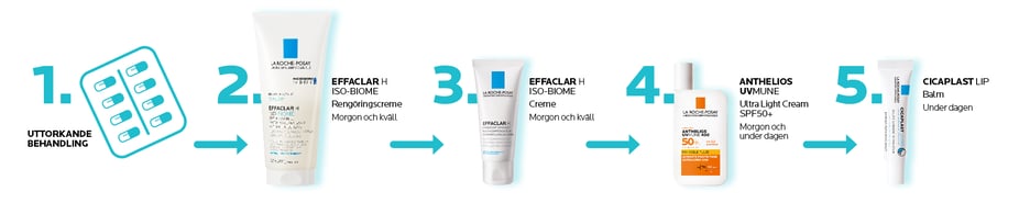 Uttorkande aknebehandlingar är väldigt effektiva, men kan ha sina sidoeffekter – som att huden blir torr och i vissa fall även irriterade. Även rödhet, grovhet och ibland brännande känsla och stramhet i huden är vanligt. Därför är det bra att välja en ansiktsrengöring i form av rengöringskräm eller mousse som ger fukt och lugnar huden. Se till att använda en mild rengöringskräm som passar känslig hud och som stärker upp hudbarriären. Kolla efter ingredienser som Niacinamid och thermalskt källvatten, och kom ihåg att använda ansiktsrengöring morgon och kväll.