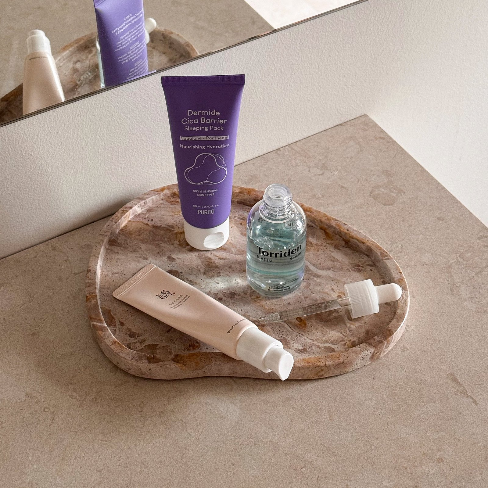 En mild ansiktsrengöring är A och O. Undvik starka produkter som torkar ut huden. Testa att dubbelrengöra huden (oljerengöring + vattenbaserad rengöring) för att ta bort smuts och smink utan att torka ut huden.