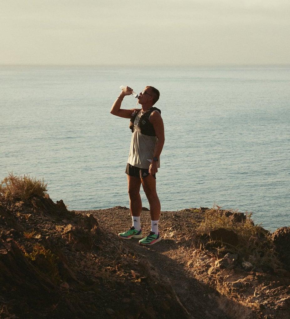 Jag dricker sportdryck från Maurten (Drink Mix 320 och 160) före och under träning. Den förstnämnda innehåller koffein (det är bevisat att koffein kan främja pigghet, minska upplevd ansträngning och smärta) utan att man känner den bittra smaken. Under ett maratonlopp tar jag även gel, som är en koncentrerad kolhydratslösning, från Maurten. När det kommer till just gel är det viktigt att du prövar dig fram. Vi är olika när det gäller vad vi tycker om och vad vår mage tolererar. Efter passet fyller jag på med vätska, kolhydrater och protein.